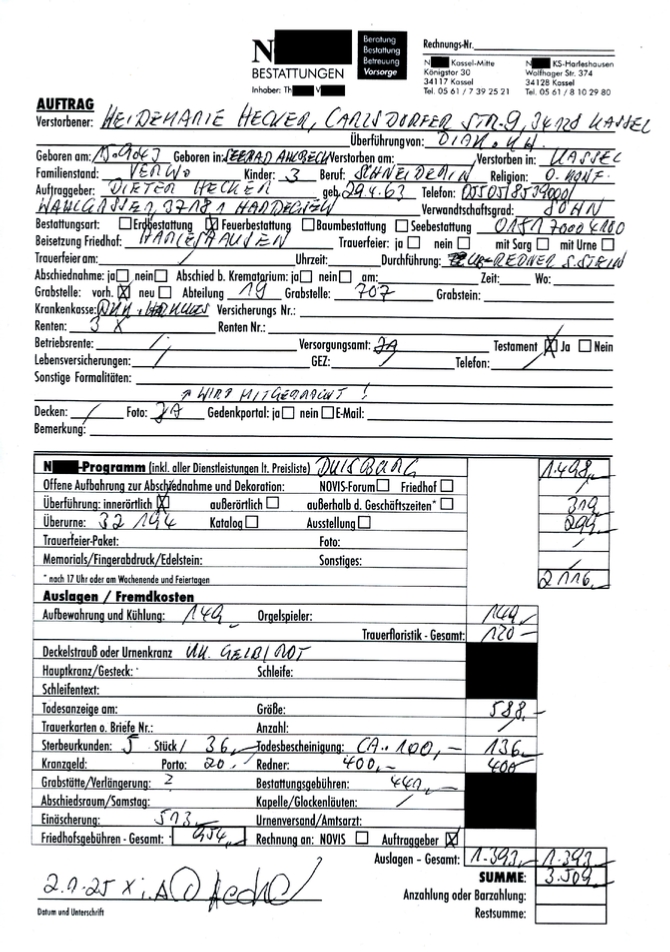 Wir, die Hinterbliebenen, hatten das Bestattungsinstitut N**** in Kassel-