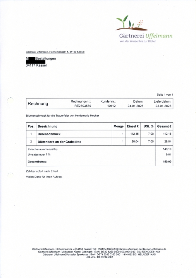 Als ich dann die Rechnung vom Bestattungsinstitut N**** erhielt, die ich übrigens mehrfach per Mail anfordern musste, weil N**** nicht in die Pötte kam, sah ich anhand der beigefügten Rechnungen, durch das Bestattungsinstitut N**** beauftragten Drittfirmen, dass das Bestattungsinstitut N**** eigenmächtig einen Blumenkorb für 30,00 Euro in Auftrag gab und diesen mit uns abrechnete, obwohl wir nur einen Trauerkranz für 120,00 EUR in Auftrag gaben (siehe obigen Auftrag und unten befindliche Rechnung der Gärtnerei Uffelmann).
