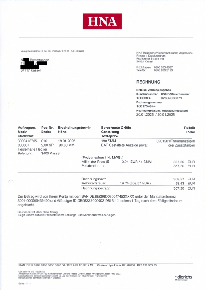 Deshalb war die Traueranzeige kleiner ausgefallen als besprochen und zudem unscharf abgedruckt, weil N**** komplett unprofessionell handelte und ein für den Druck ungeeignetes komprimiertes und herunterskaliertes Dateiformat, an die HNA übersandt hatte.