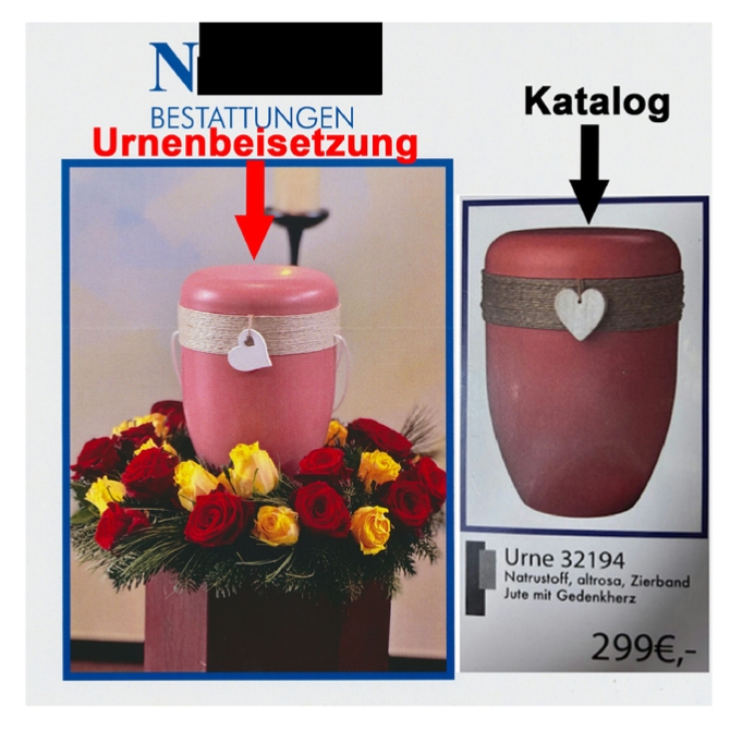 Am Tag der Urnenbeisetzung wurden wir, anstatt mit einer dunkelroten mit dunkelbraunem Bast abgesetzten und mit einem hellen Herz aus Holz als Urne, mit einer Urne in der Farbe Schweinchenrosa mit hellen, fast weissem Bast und einem lieblos hängenden Herz im Trauerraum konfrontiert.